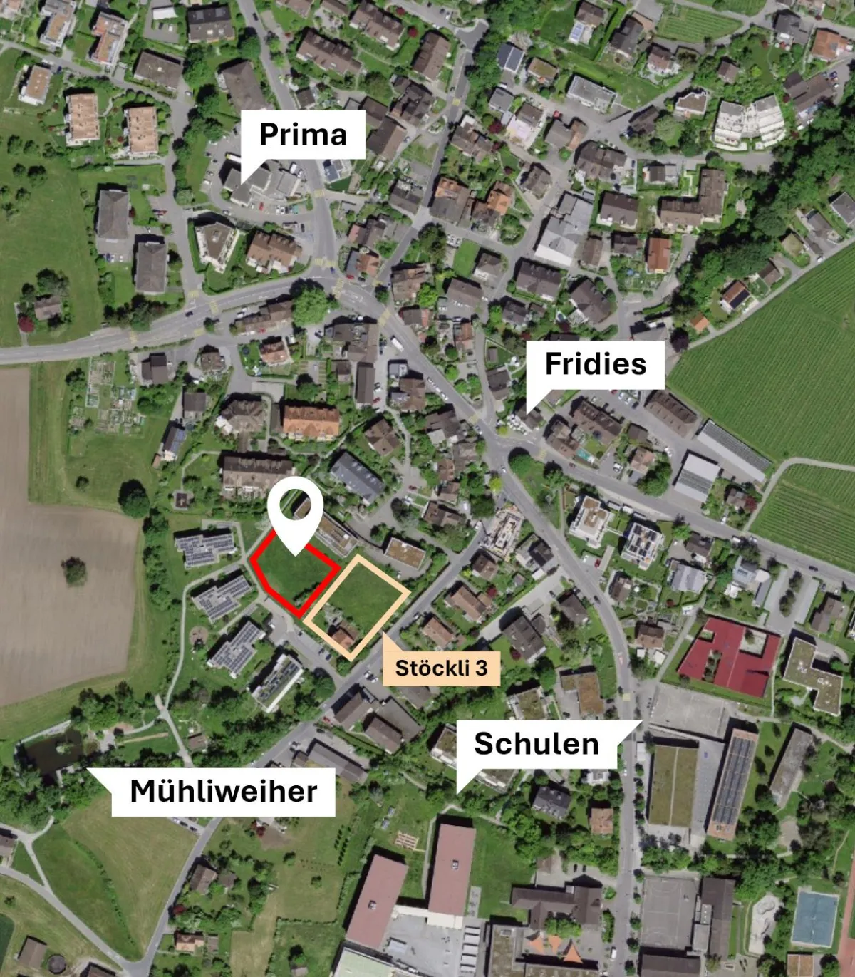 Das Asyl- und Sozialwohnprojekt ist mitten in einer Wohnzone geplant – nur wenige Schritte von Schulen, dem Spielplatz Mühliweiher und dem Zentrum von Uetikon entfernt.